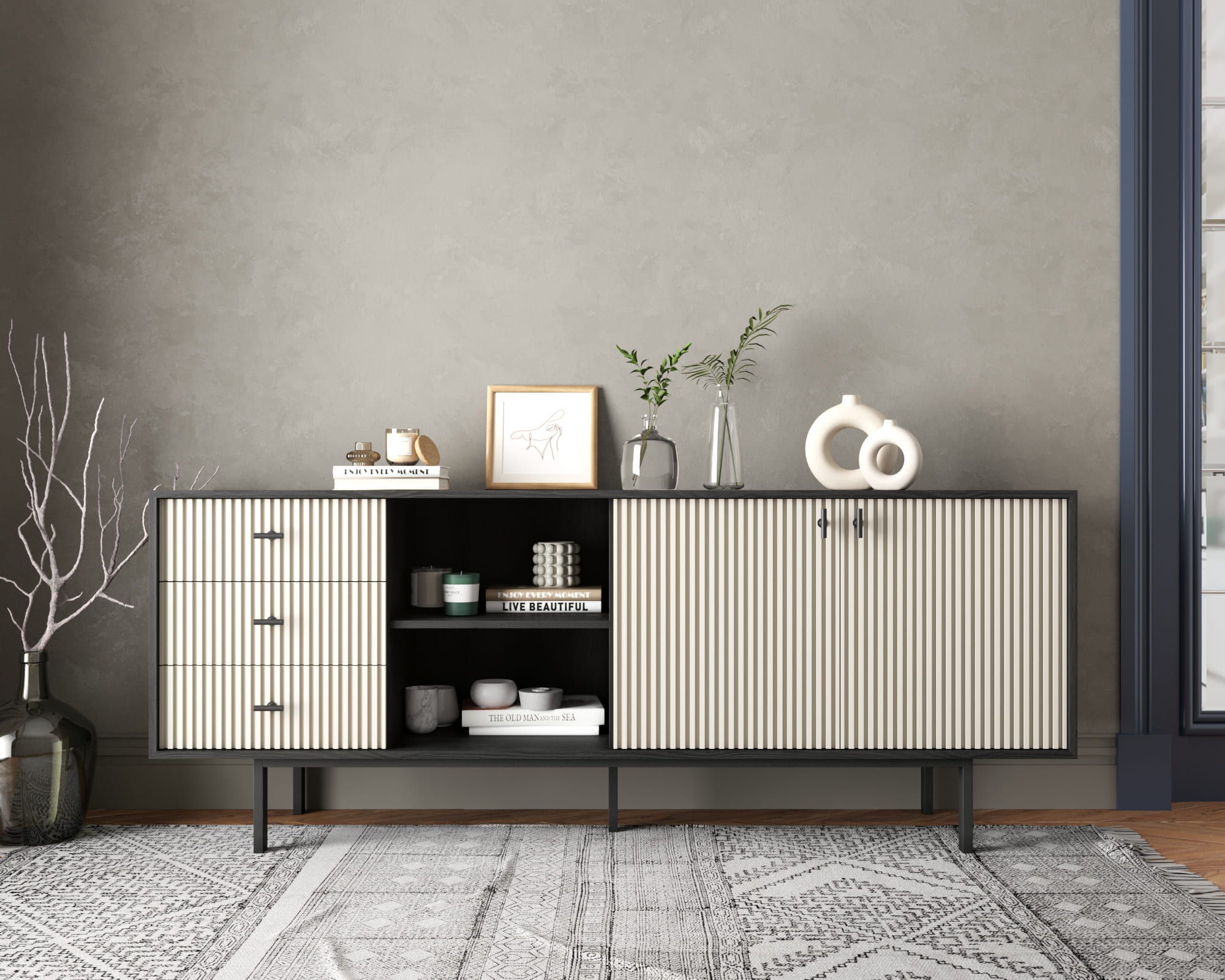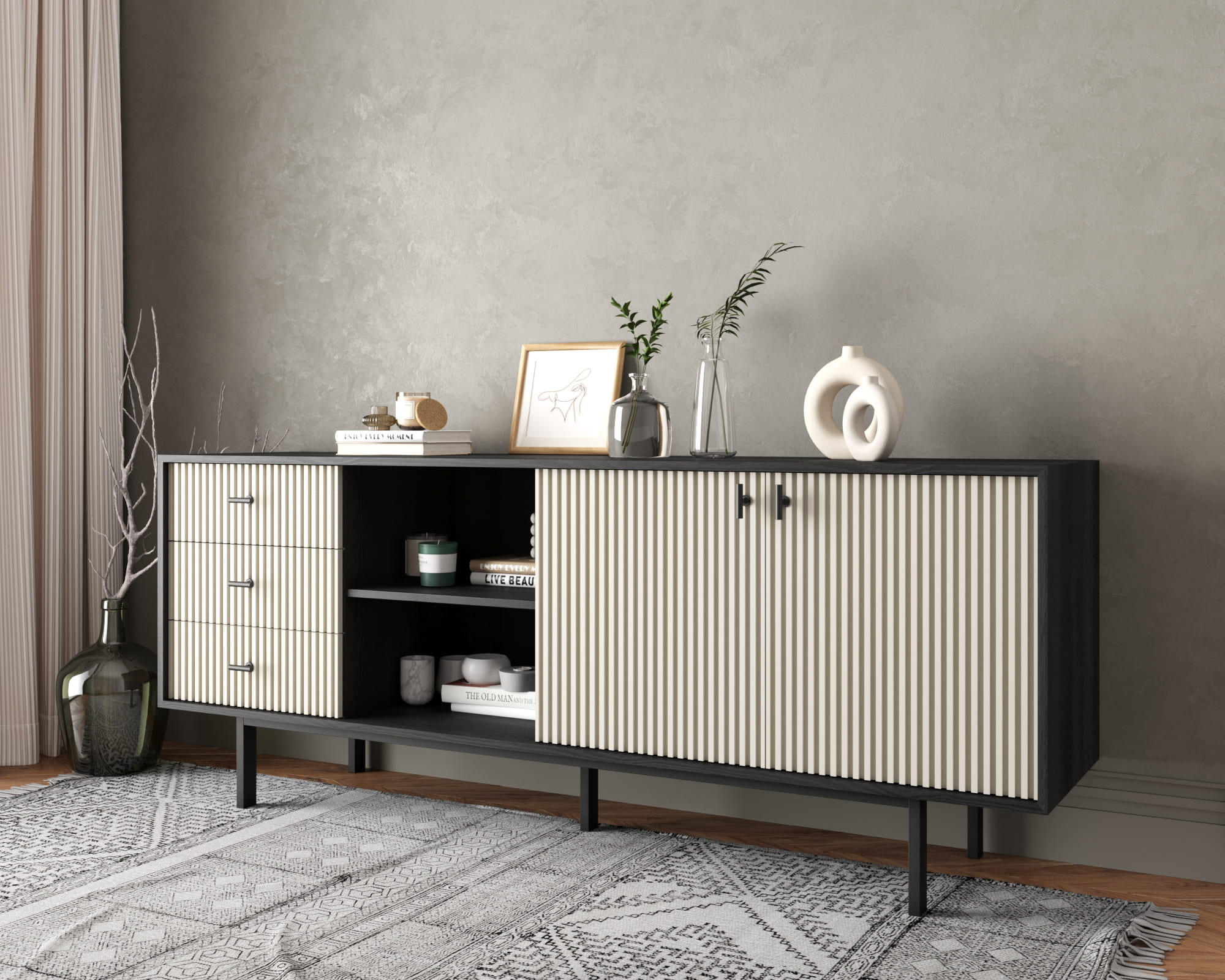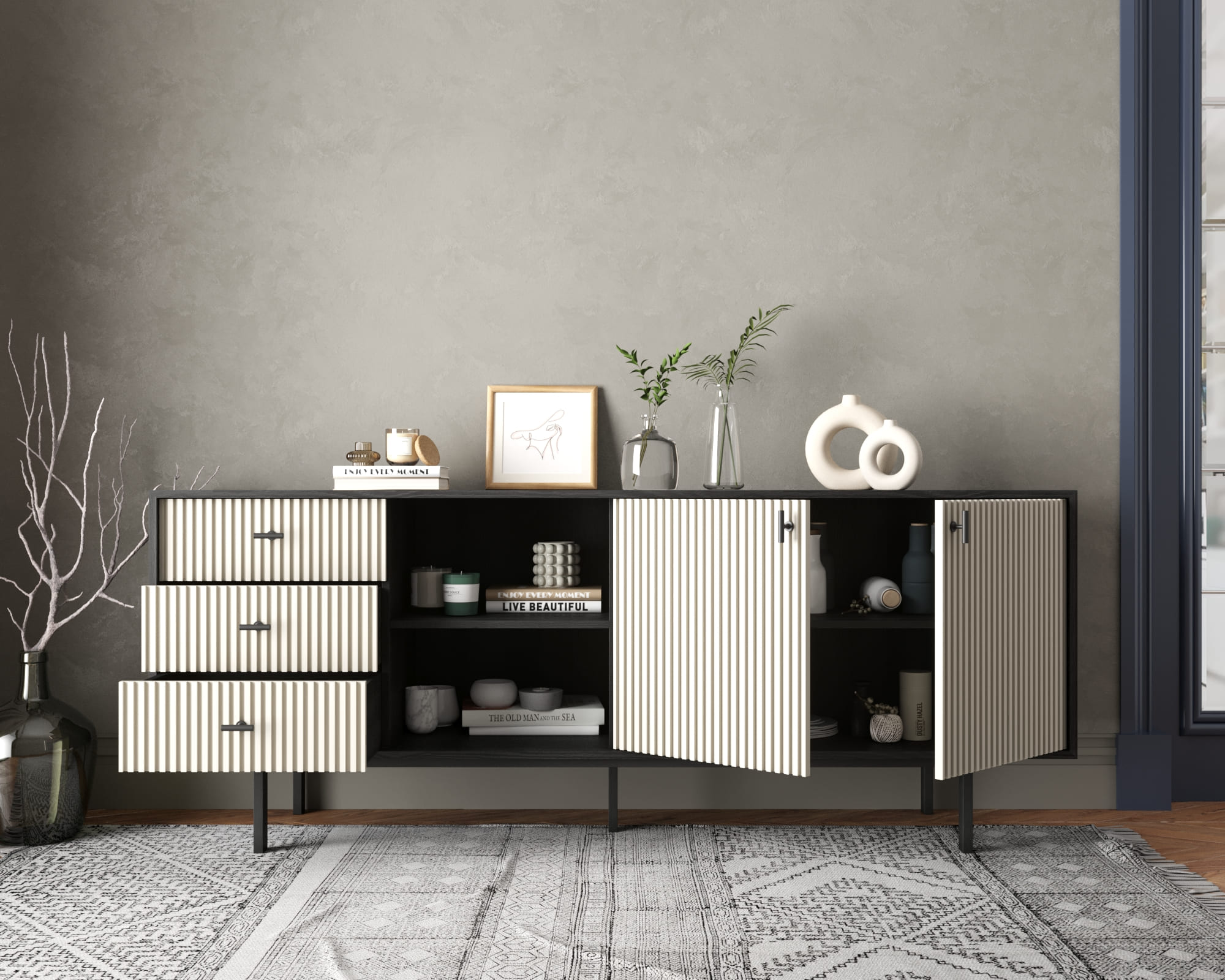Мы предлагаем различные варианты исполнения: с фасадами или с фасадами и ящиками. Петли с доводчиком обеспечивают плавное закрывание дверей, а шариковые направляющие без доводчика позволяют легко выдвигать ящики. Комод поставляется в сборе, что упрощает его установку.