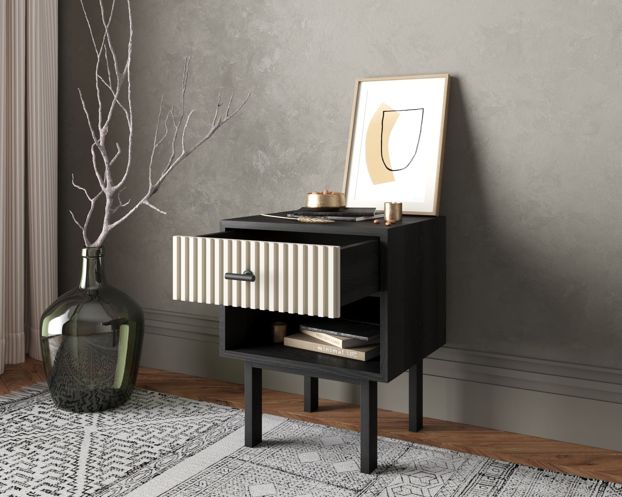 Фасады тумбы изготовлены из ламинированной древесно-стружечной плиты (ЛДСП), которая обеспечивает долговечность и надёжность изделия. Внутри тумбы расположены один или два ящика с шариковыми направляющими без доводчика. Это позволяет легко открывать и закрывать ящики.