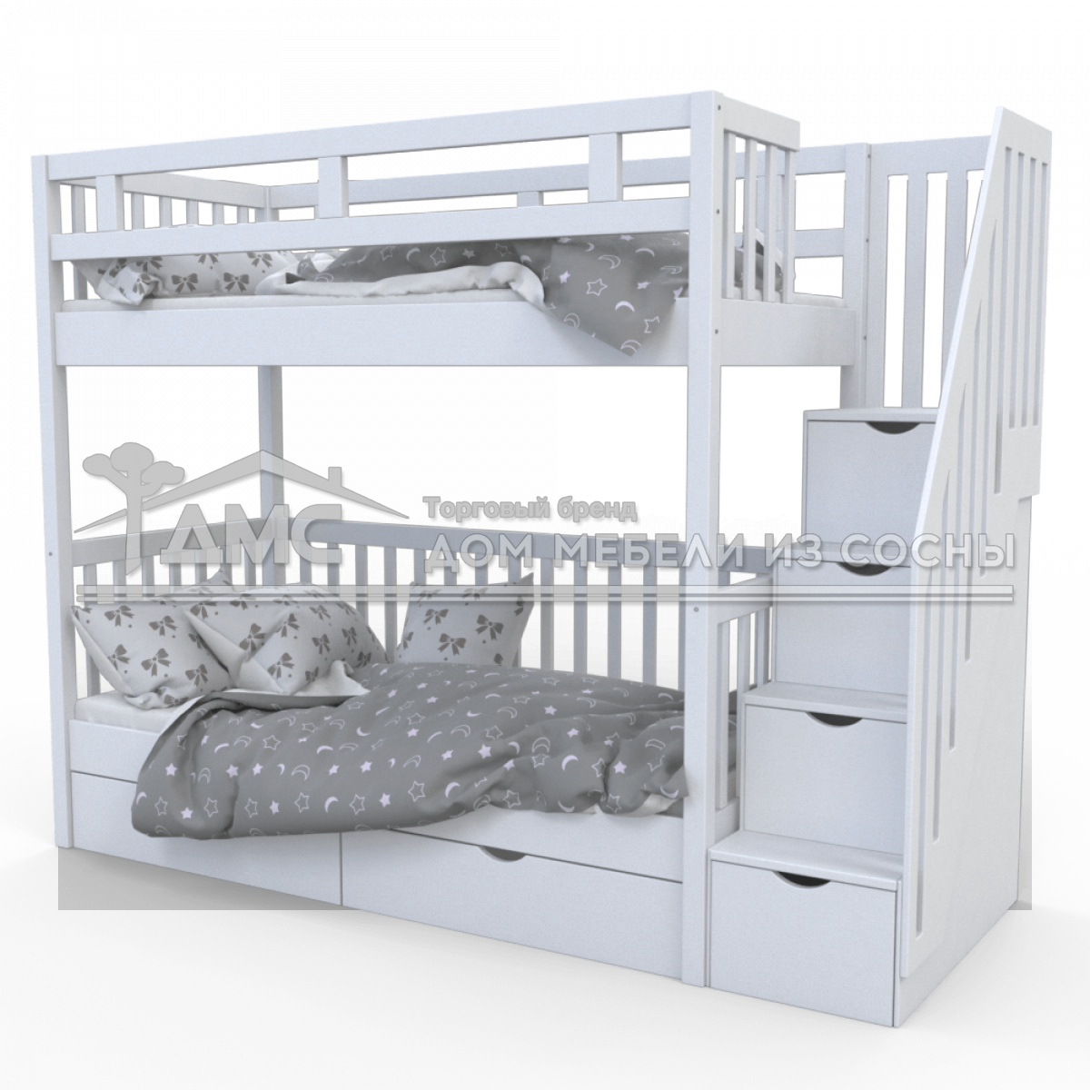 Особенностью конструкции является то, что для подъёма на второй этаж используются не лестницы, а удобные ступеньки, которые также выполняют роль дополнительной системы хранения. Это делает кровать не только функциональной, но и стильной.