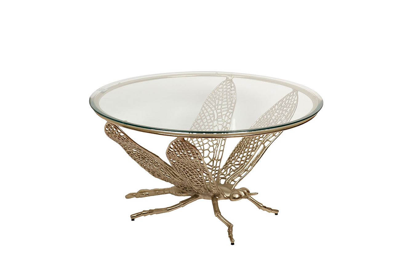 Удивительный дизайнерский стол в стиле ар-деко сделает вашу спальную комнату, гостиную или холл единственными в своем роде! Изящная стрекоза из золотистого металла подпирает крыльями столешницу из прозрачного закаленного стекла. Этот стол ручной работы по...