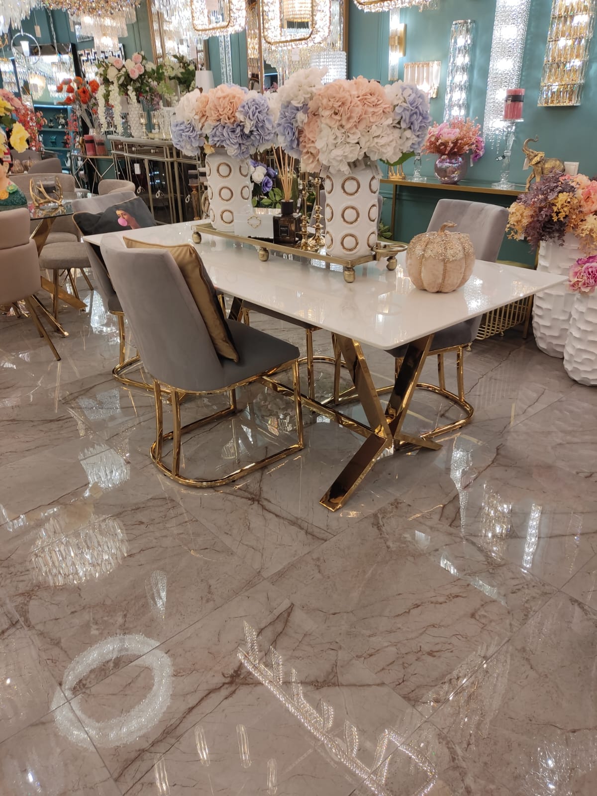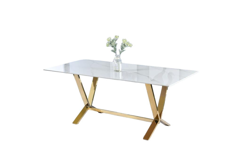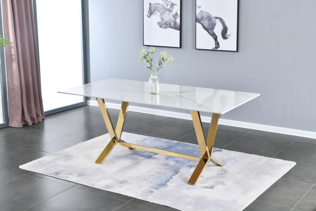 Стол обеденный Столешница - керамогранит, цвет: белый мрамор Основание: нержавеющая сталь, глянцевое золото 180х90х75 см Страна производитель: Китай Гарантия 1 год