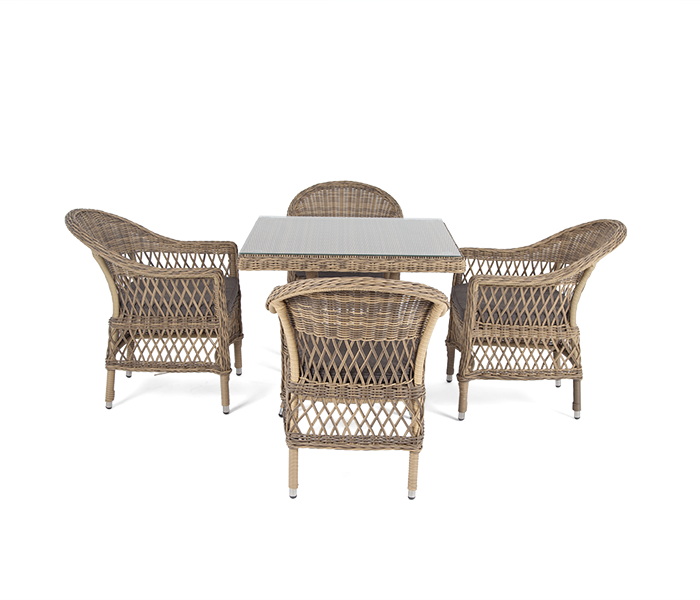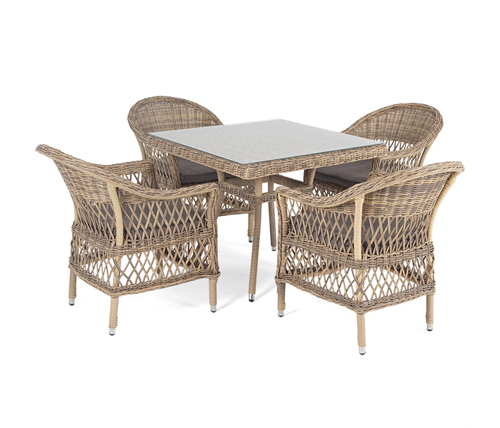 Комплект «Сишиллио» - это обеденная группа из искусственного ротанга, которая рассчитана на 4 персоны. В комплект входит: -обеденный стол (900×900×750 мм) -4 обеденных кресла (590×640×820 мм) Мебель имеет надежный каркас из легкого алюминия. Изделия дополнительно оплетены ручным методом круглым искусственным ротангом натурального цвета соломы. Стол оборудован столешницей из стекла, которой не страшна горячая посуда. Кресла оснащены подушками со съемными чехлами серо-коричневого цвета. "Арлиш" стол плетеный из искусственного ротанга, цвет соломенный 1шт. 900Х900Х750, "Сишиллио" плетеный стул из искусственного ротанга, цвет соломенный 4шт. 590Х640Х820,