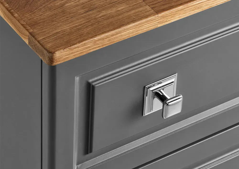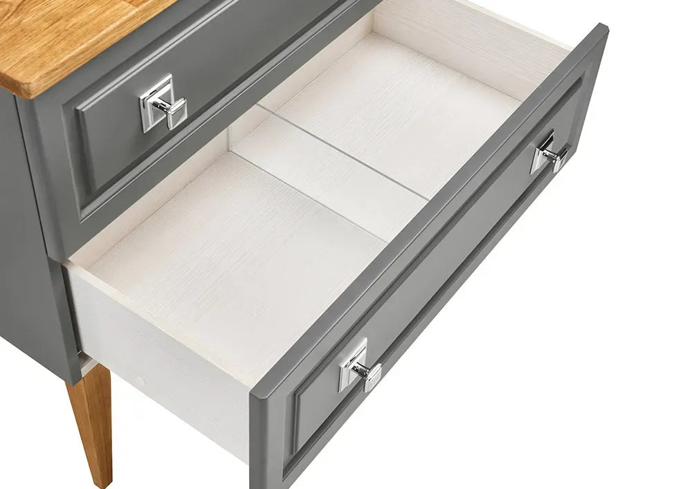 Как и в других коллекциях ASB-Woodline, в коллекции «Каталина» используется фурнитура европейского производства. Ящики зонированы для удобного хранения вещей, закрываются без хлопков. В пенале есть съёмные стеклянные полочки. Ручки имеют устойчивое антикоррозийное покрытие.