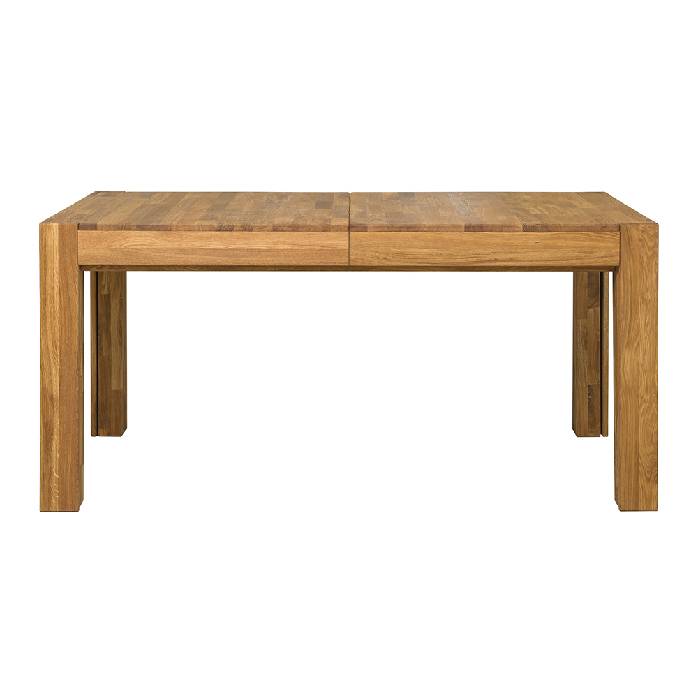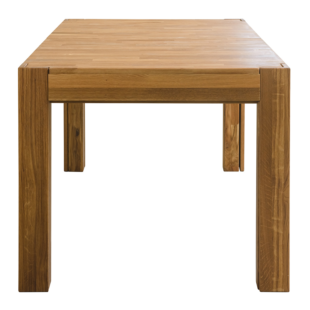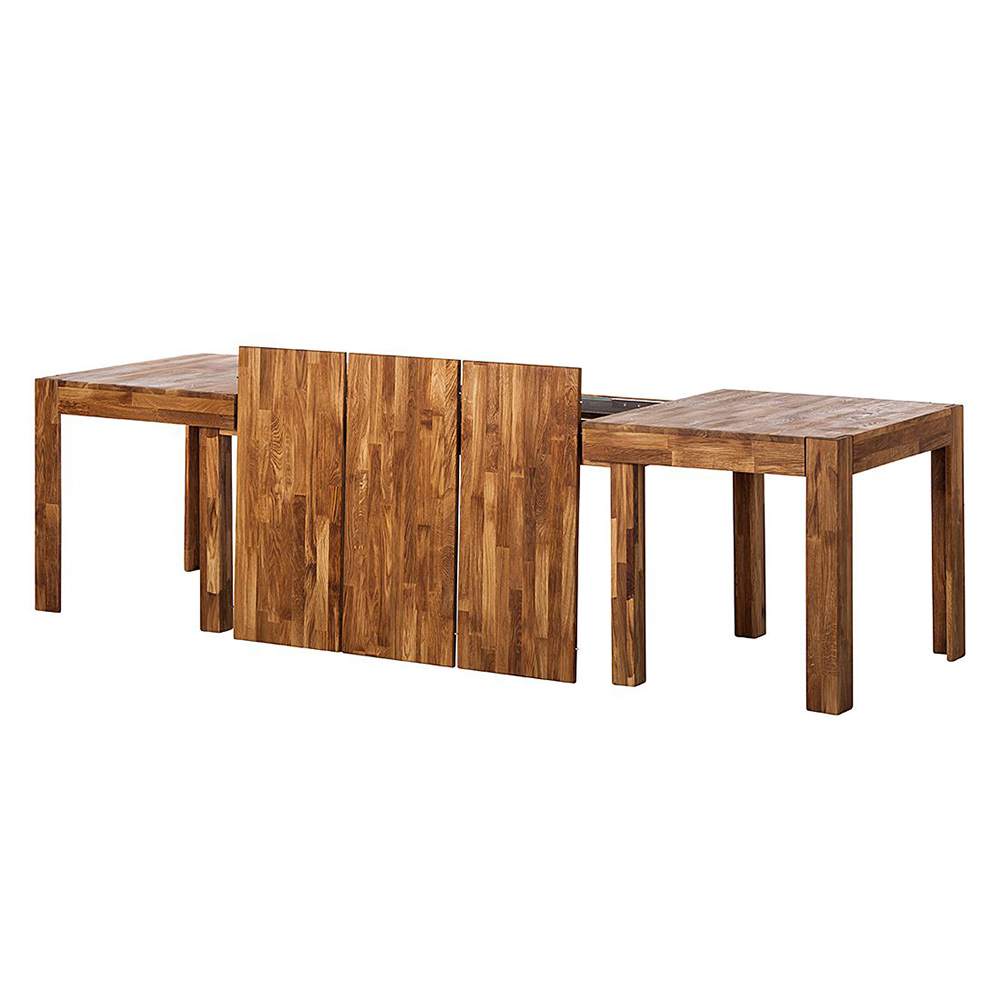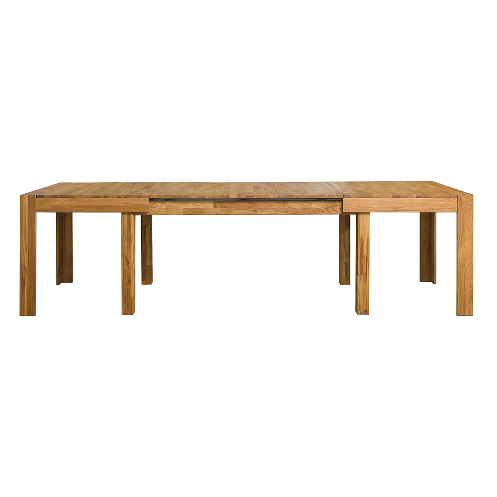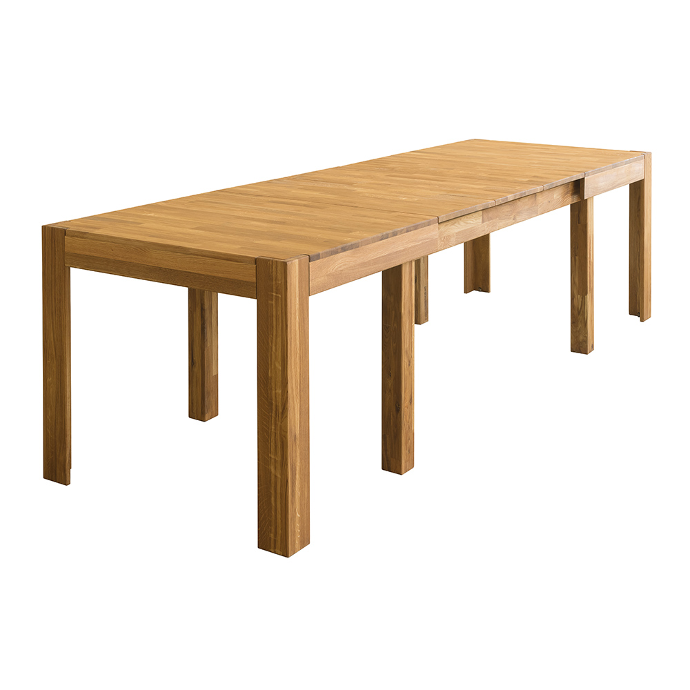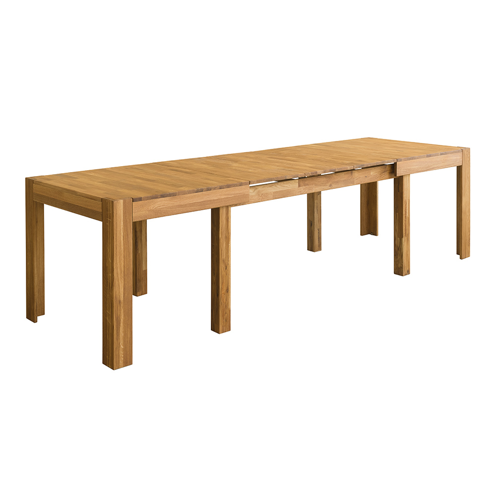 Раздвижной стол изготовлен из натурального и долговечного материала – массива дуба. Доступно шесть вариантов отделки: бейц-масло, дуб отбеленный, дуб паркетный, дуб венге, тёмная вишня и итальянский орех. Вы можете выбрать тот вариант, который лучше всего подойдёт к вашему интерьеру. Стол имеет массивные устойчивые ножки, верхние поверхности ножек сделаны в уровень со столешницей. При раздвижении выдвигаются дополнительные ножки, которые в сложенном виде вложены в основные, так что стол становится более устойчивым.