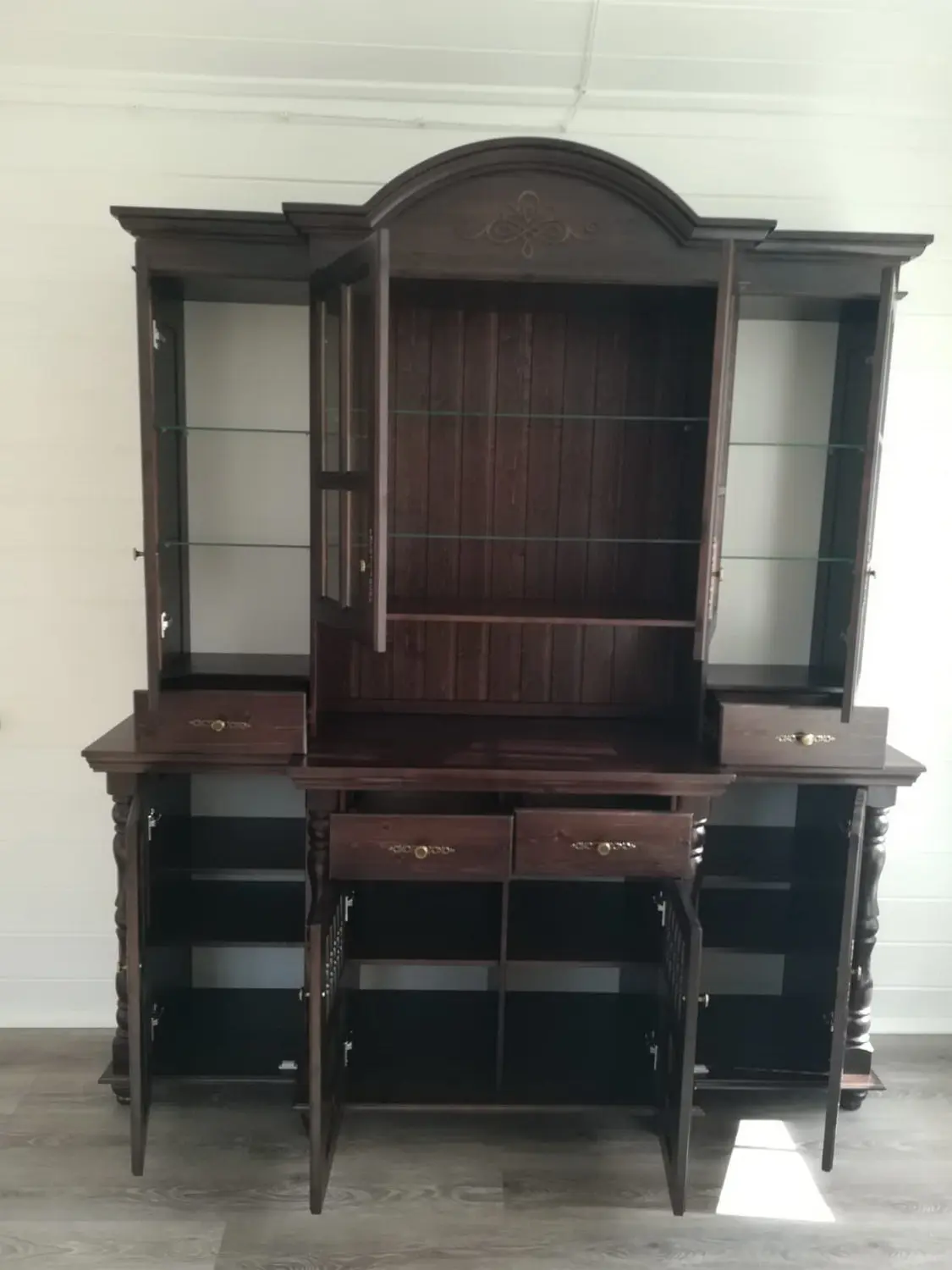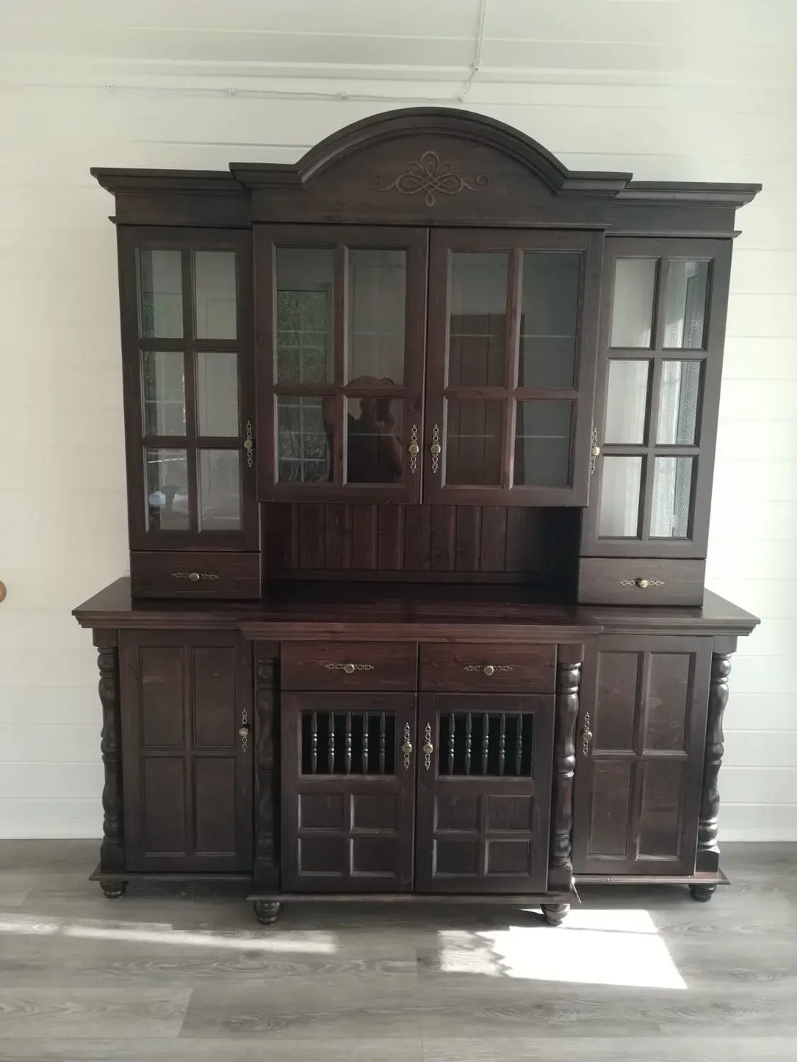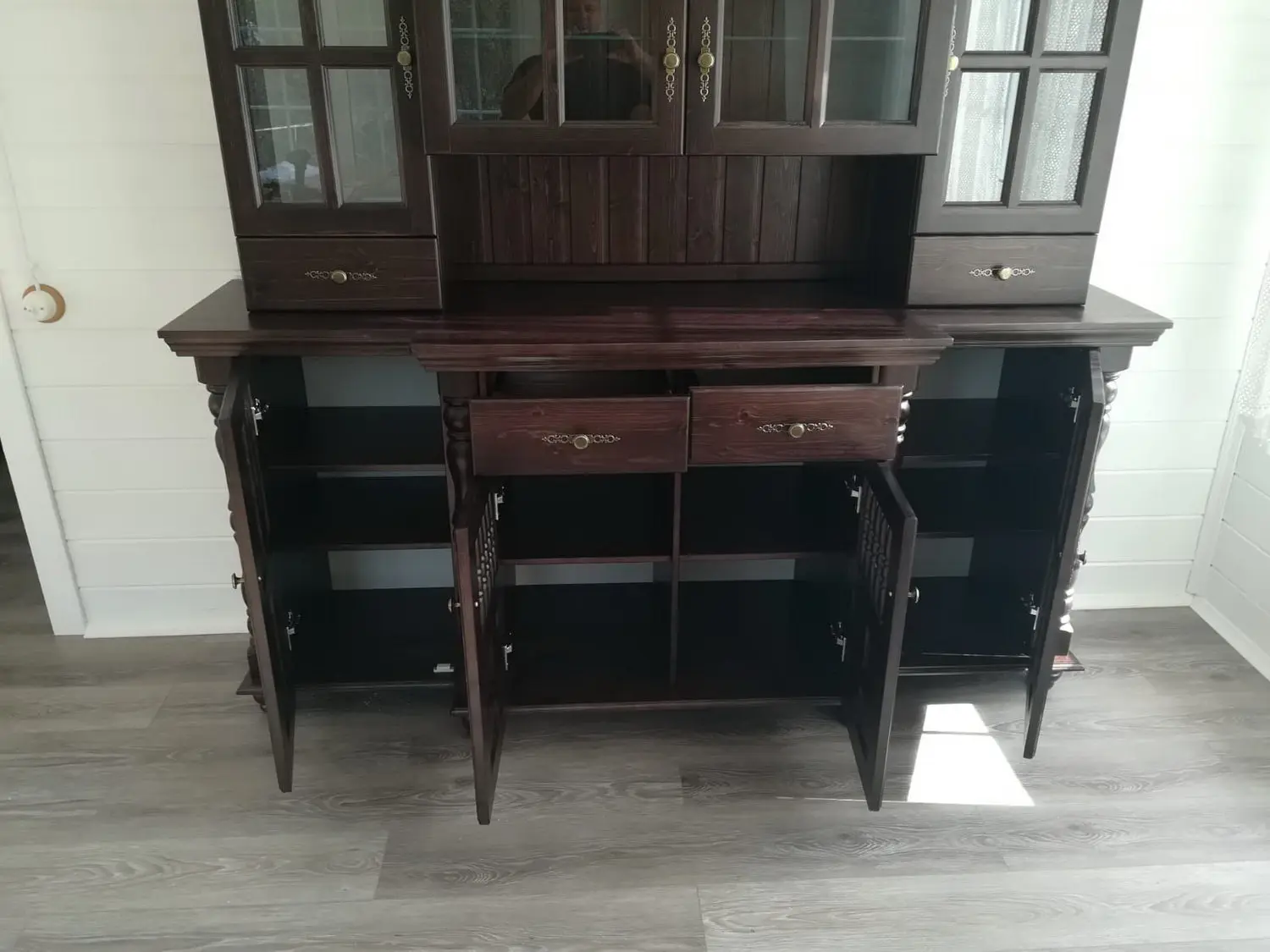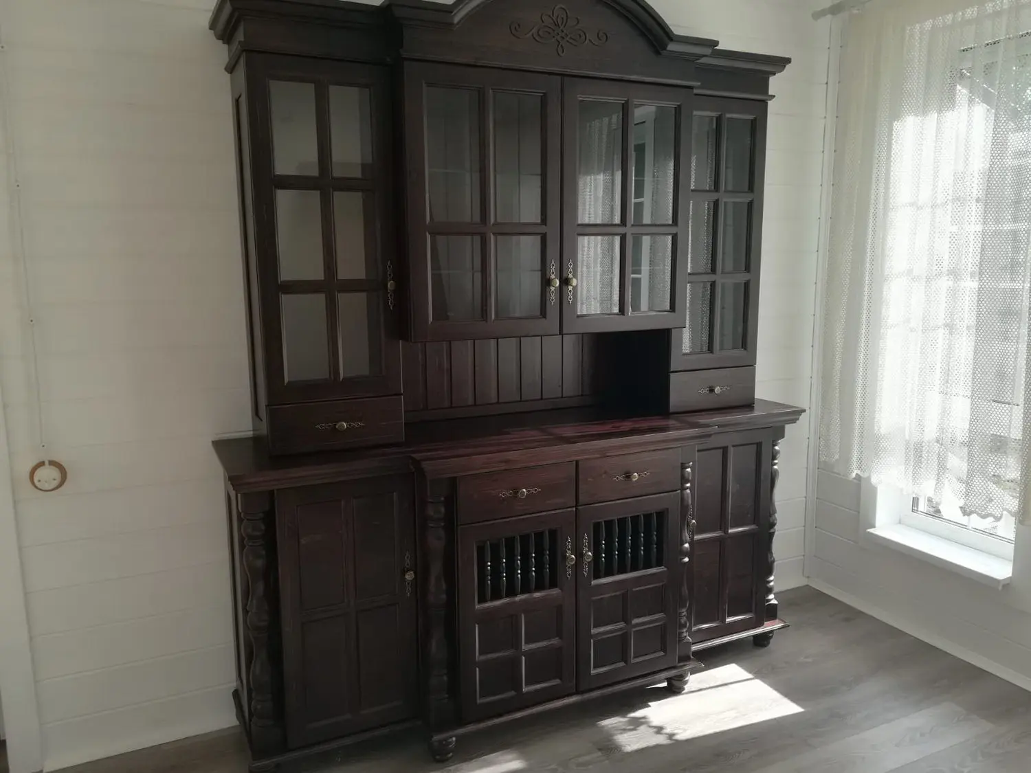 Материал - сосна, задняя стенка, дно ящиков - ДВП белого цвета, вставки в боковинах и в дверях (филенка) - фанера (6 мм).