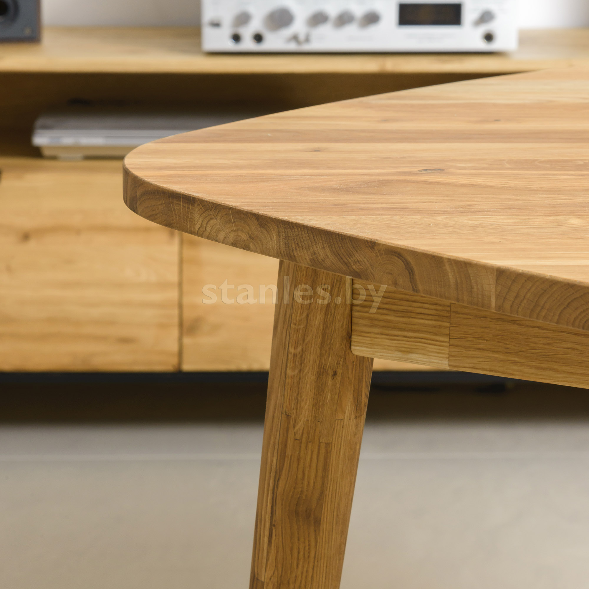 Столик изготовлен из натурального и долговечного материала – массива дуба. Доступно шесть вариантов отделки: бейц-масло, дуб отбеленный, дуб паркетный, дуб венге, тёмная вишня и итальянский орех. Вы можете выбрать тот вариант, который лучше всего подойдёт к вашему интерьеру. Высокие ножки стола устойчивы, расположены наклонно. Габариты стола 1310х1291х750 мм, вес 35 кг. Гарантия на стол составляет 1 год.