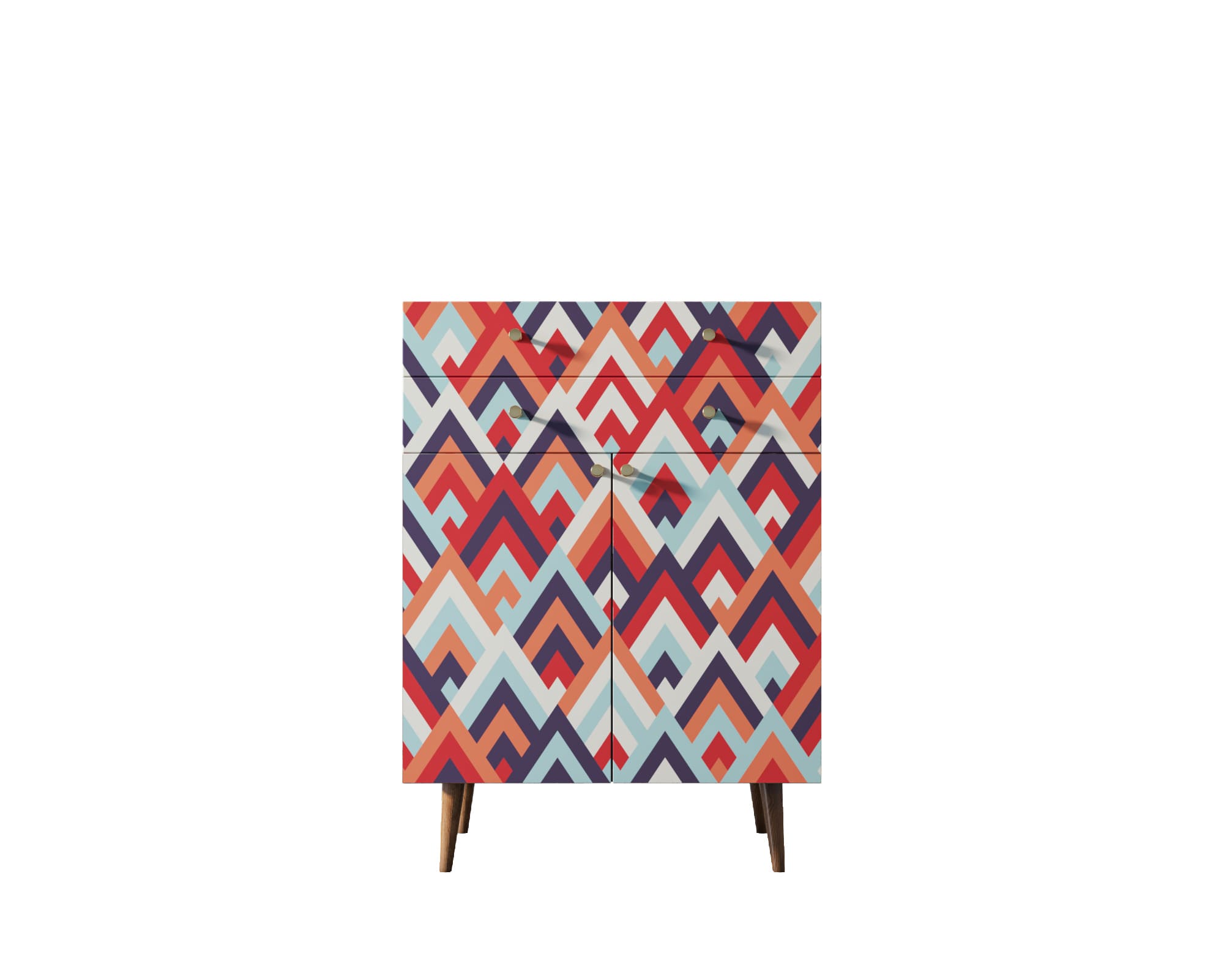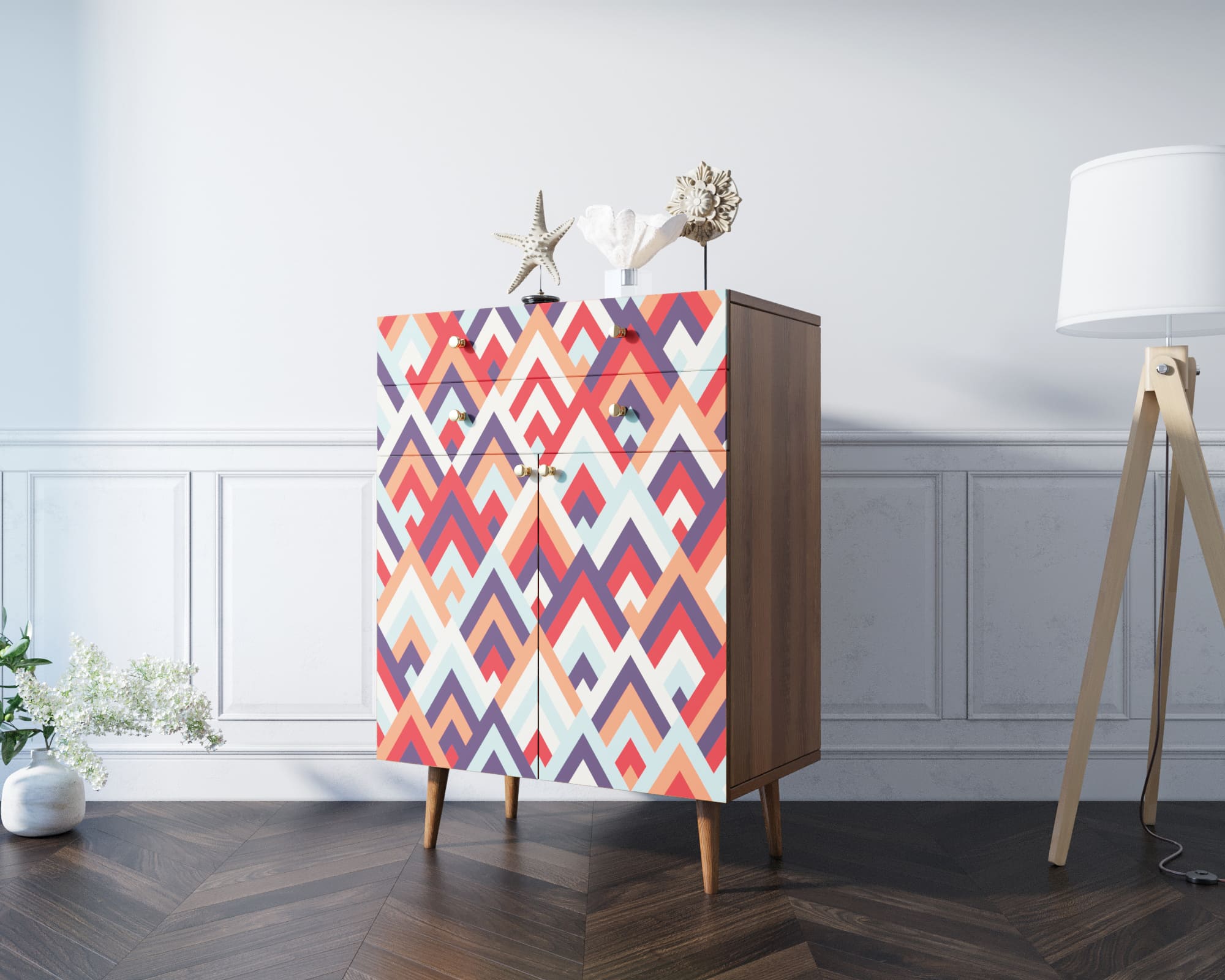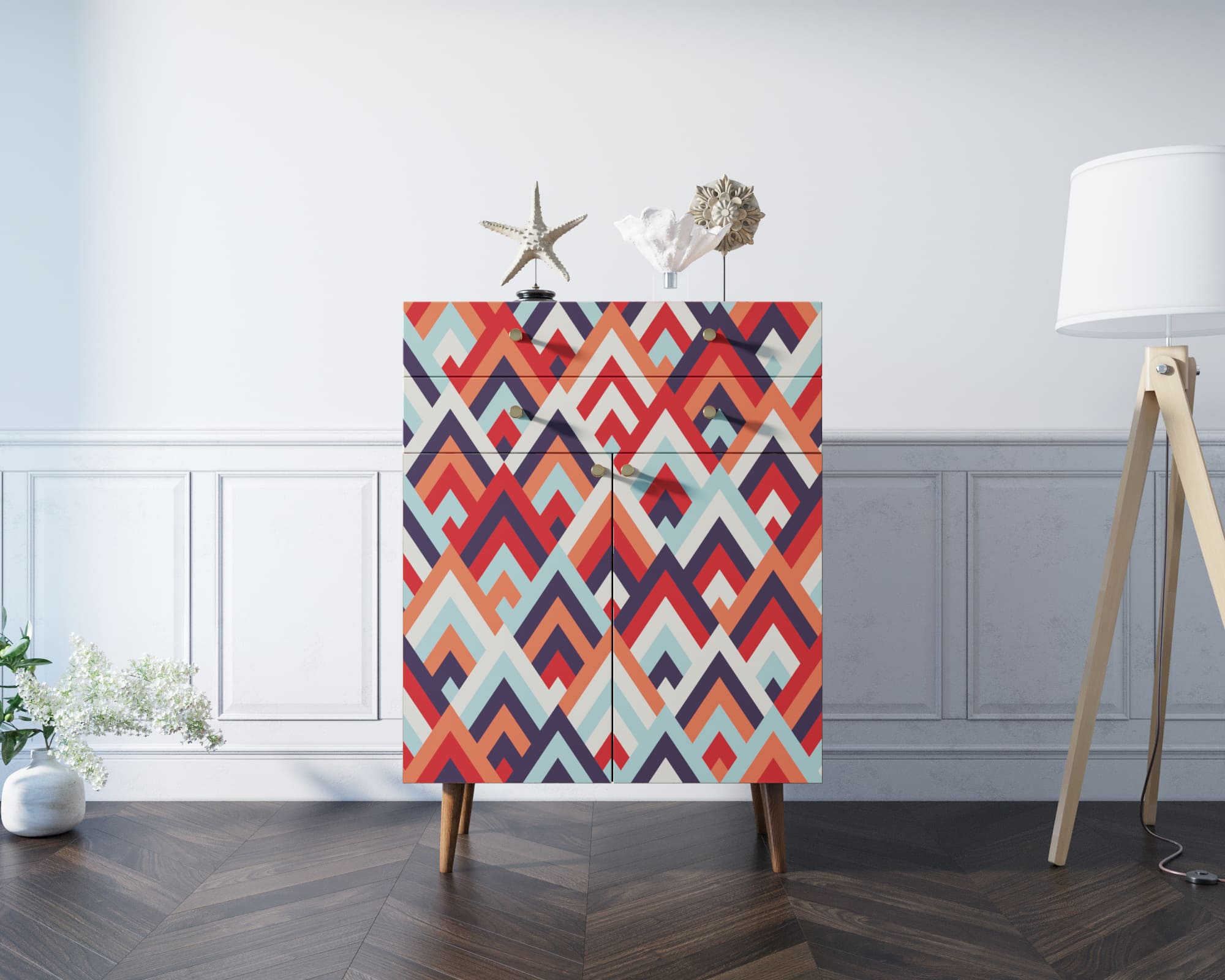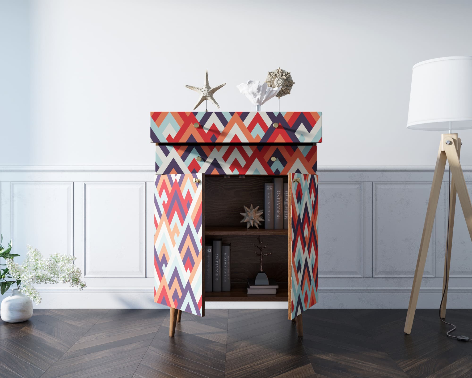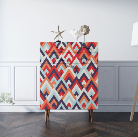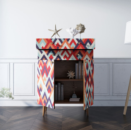 Корпус и ящики изготавливаются из ЛДСП австрийской компании "EGGER". Ножки мы делаем из массива ясеня и крепим на стальную пластину, на дверях петли с доводчиком а на ящиках шариковые направляющие. Принт на фасады наносится принтером специальными УФ - чернилами.