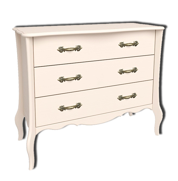 Лебо - изящная коллекция мебели во французском стиле. При изготовлении комода, кроме массива сосны, не применяется никакие другие материалы, наподобие дсп, мдф и других материалов, которые могли бы поставить под сомнение прочность и надежность конструкции. Комод Лебо с 3-мя ящиками удобная и функциональная мебель. Он легко впишется как в маленькие комнаты, так и в просторные помещения. Габаритные размеры комода 1080*450*855 (Ш*Г*В). В нем удобно хранить как постельное белье, так и одежду. На комод можно устанавливать теле и радиоаппаратуру, а также использовать как повседневный столик для косметики и других вещей. В комоде Лебо 3 ящика. Направляющие ящиков с доводчиками скрытого монтажа от крупнейшего международного предприятия BLUM (Австрия). Это обеспечивает плавный, бесшумный ход ящиков. Внутренние части выдвижных ящиков окрашены в цвет корпуса и фасадов мебели. В коллекции используются мебельные ручки фирмы Giusti (Италия). Изысканные гнутые ножки придают изящество и подчеркивают стиль Прованс. Такое изделие прекрасно впишется как в классический, так и в другой интерьер. Изделие изготовлено из массива сосны и выполнено в цвете – бежевый воск, в котором структура дерева слегка просвечивает. Комбинация цвета бежевый воск/антик подразумевает отделку столешницы в цвет «антик», остальная часть изделия в цвете «бежевый». Комод Лебо с 3 ящиками поставляется в разобранном виде. Размеры упаковки: 1уп.-1110х510х140