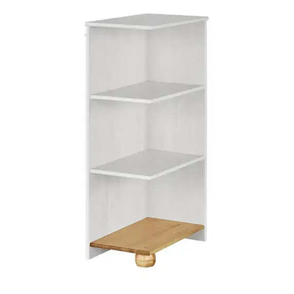 Белый стеллаж Хельсинки из массива сосны Угловой стеллаж “Хельсинки” - отличное приобретение для того, чтобы привить ребенку любовь к порядку. Представляет собой три удобные полки для хранения книг и игрушек, может использоваться как составная часть комода из этой же коллекции. Особенности Размеры стеллажа Хельсинки 48 х 93 х 29 см; Основа - натуральная сосна; В комплекте немецкая фурнитура; Доступен в двух цветах: “антик” и “белый воск”. Особенности покрытия Случайная порча мебели - обычное дело в детской комнате. Поэтому лучше приобретать изделия из настоящего дерева, которое отличается прочностью и долговечностью. В данном случае была дополнительно произведена обработка водными лаками и красками, которые призваны беречь его от воздействия излишней влажности, разбухания полотен, появления плесени и грибков.