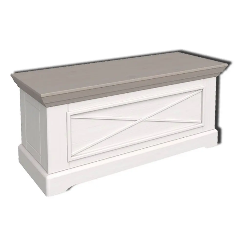 Поставляется в цвете – «белый воск/серый (антрацит)». Комбинация цвета подразумевает отделку крышки сундука в цвет «антрацит» (серый), остальная часть изделия в цвете «белый воск». Структура дерева слегка просвечивает.