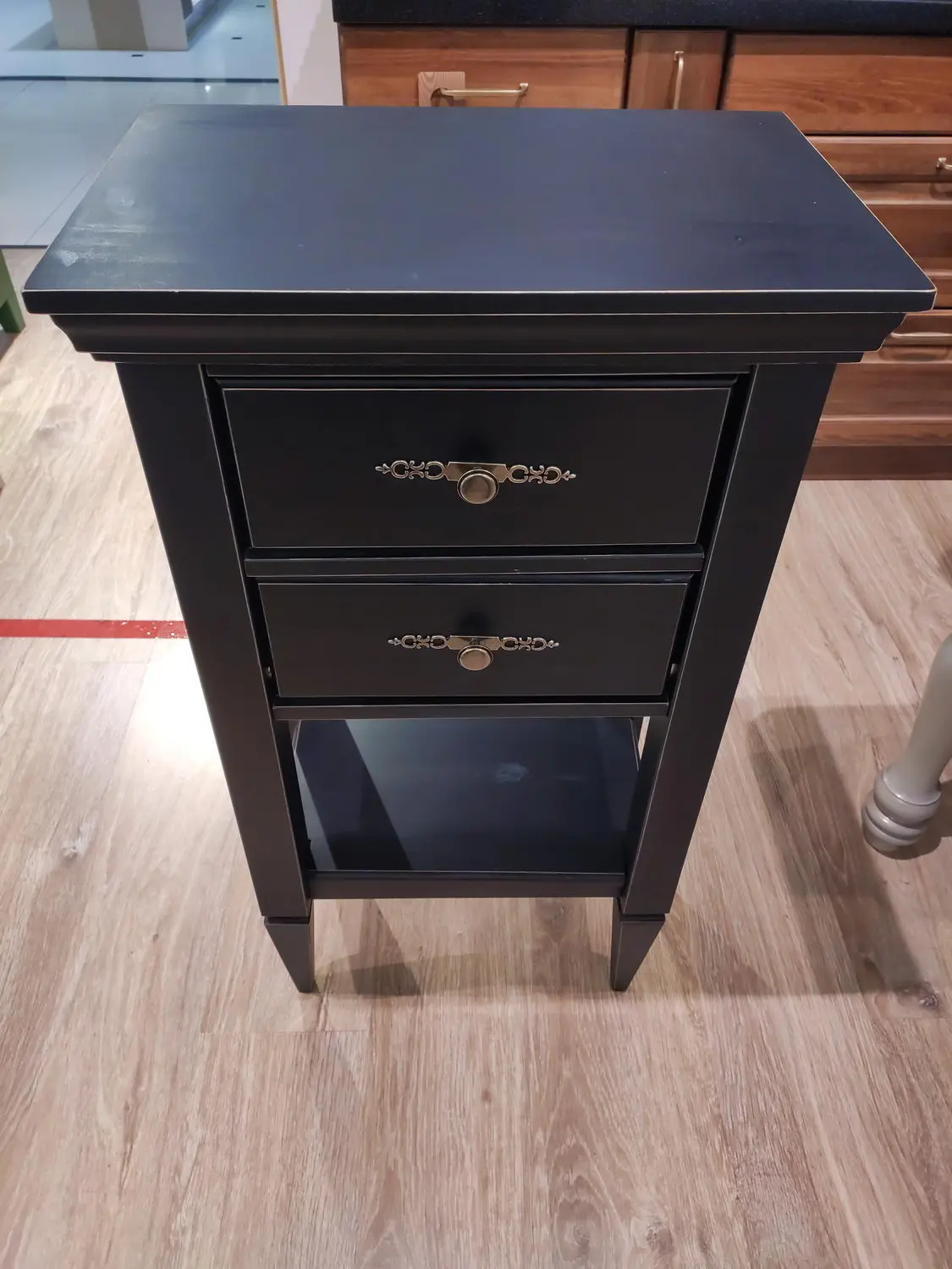 Расстояние от пола до полки - 200 мм, от полки до ящиков - 350 мм.