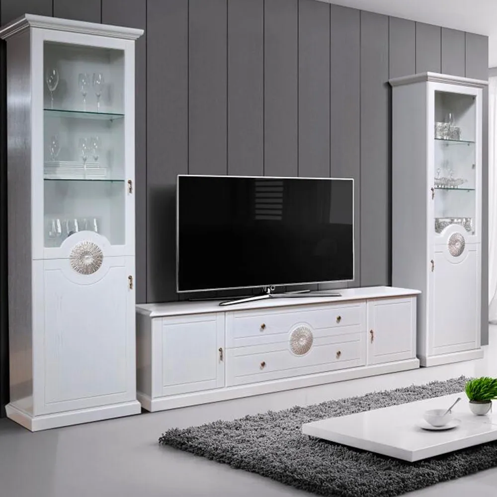 Мебель для гостиной «Власта» отличается приятной светлой тонировкой и оригинальным дизайном фасадов с накладным декором. Это хороший выбор для приверженцев простых классических интерьеров. В коллекцию входят комоды с дверцами и ящиками, шкафы-витрины, навесное зеркало, тумба ТВ.