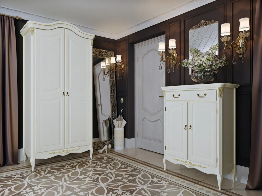 Стандартная отделка для этой коллекции – «слоновая кость» с золотой патиной. Также можно выбрать тонировку по палитре, предложенной производителем мебели: предлагается большой выбор цветов и оттенков: белый, молоко, серо-бежевый, розовая пудра, шоколад, светлый беж, светло-серый, серо-коричневый, сланцево-серый, серо-коричневый, бежевый, серый и другие. Ознакомиться со всей палитрой можно по телефону или в фирменных салонах «ДМС-Маркет», обращайтесь к нашим консультантам. Доступные обивочные ткани: велюр, микровелюр, рогожка, жаккард, букле, искусственная кожа.