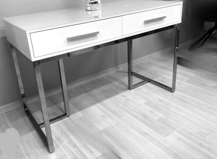 Этот стол-консоль обладает лаконичным дизайном, поэтому идеально впишется в интерьер любого помещения, офиса, салона красоты или комнаты дома: поставьте стол в детскую, чтобы получился замечательный рабочий-письменный стол для школьника, в кабинет, чтобы использовать его как компьютерный столик. Вы можете поставить на стол зеркало - и вот готов отличный туалетный столик в спальню. Стол имеет два удобных ящика с полезным размером 52х28х7,5 см, в которых можно хранить документы, канцелярию, гаджеты или другие разные мелочи. Столешница – глянцевое МДФ, что экологично и безопасно для здоровья. Подстолье – нержавеющая сталь с глянцевым хромированием методом гальванического покрытия, что обеспечивает высокое качество и длительную эксплуатацию. Размер: 120x60x78 см 1шт/2корбки Размер упаковки: 130x71x23,5; 67x65x12,5 см Вес нетто: 37кг Вес брутто: 39кг Гарантия 1 год
