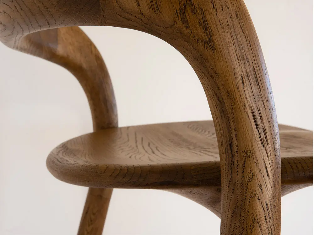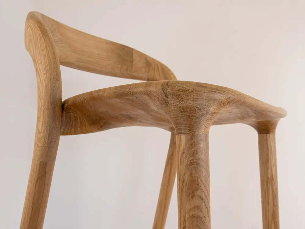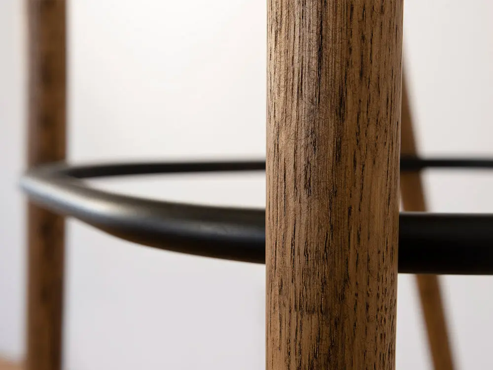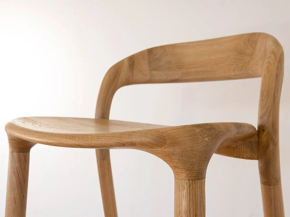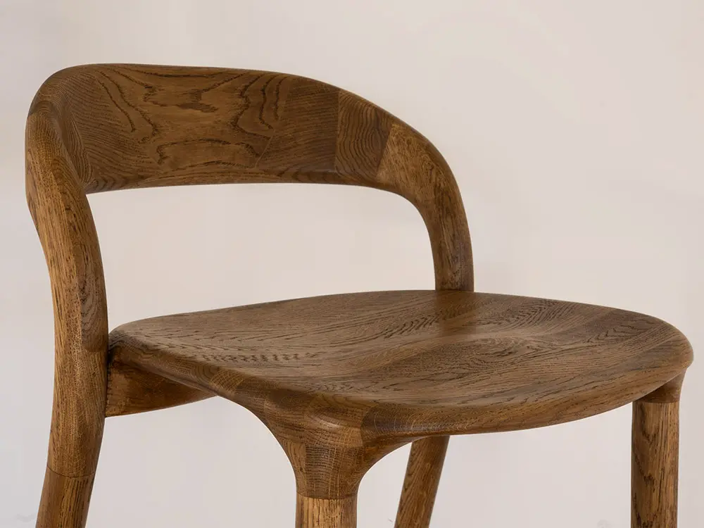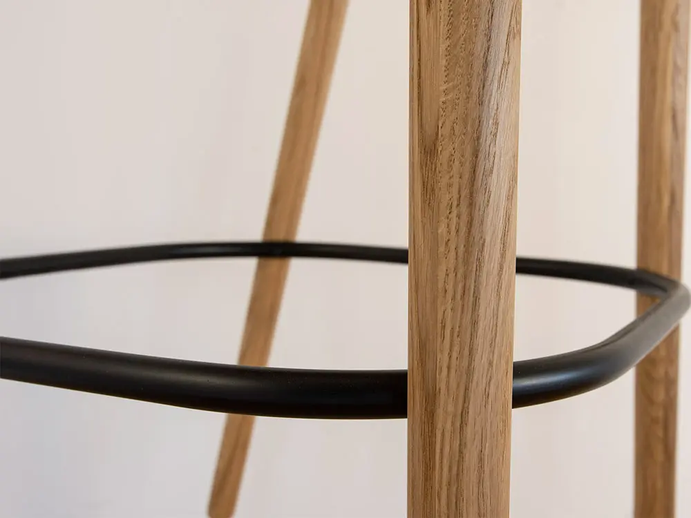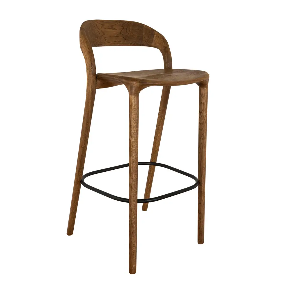 Высокий со спинкой в современном стиле барный стул. Стул оригинального дизайна и обладает хорошей эргономикой. Стул выполнен полностью из массива дуба, что гарантирует его надежность. Стул может быть выполнен в цветах на выбор: натуральный дуб, матовое масло, береза, клен, коньяк, терра, рич, беленый дуб.